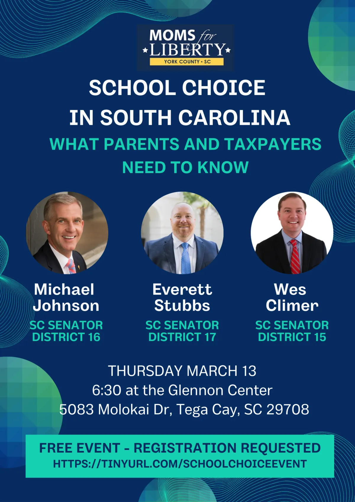 This event will be Thursday, March 13 at 6:30 at the Glennon Center in Tega Cay and will include a panel of speakers - SC Senators Michael Johnson, Everett Stubbs and Wes Climer. Our senators will discuss the pros, cons and facts regarding recent school choice legislation. Learn how it will affect your options for schools and how these changes may impact public education.