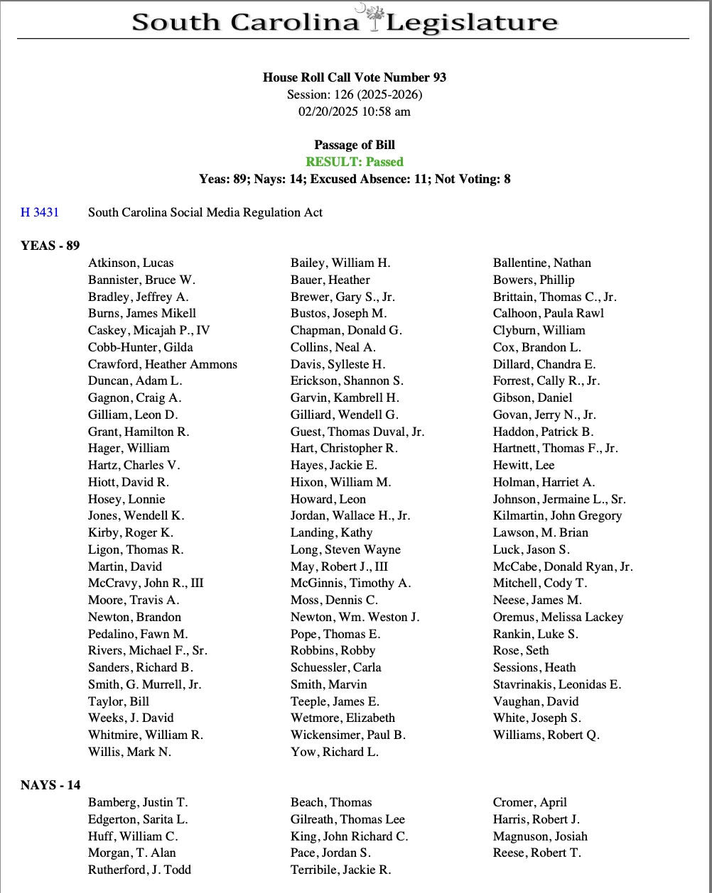 I will always support smart policies that genuinely protect children. But this bill fails to do that while creating new problems that threaten free speech, parental rights, and responsible governance. That’s why I voted no. However this bill did pass. Here is the final vote- take a look at the Yes and No votes.