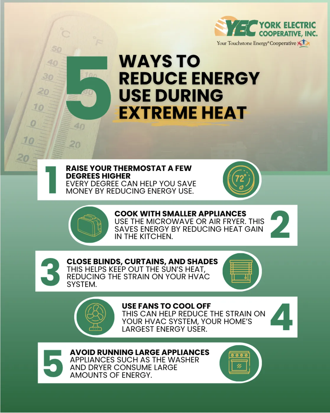 As a mom and neighbor, I know how tough this extreme heat can be-especially for families, the elderly, and anyone spending time outside. I wanted to share a few helpful tips from York Electric Cooperative that can make a real difference in staying cool and keeping energy bills down during this heatwave.